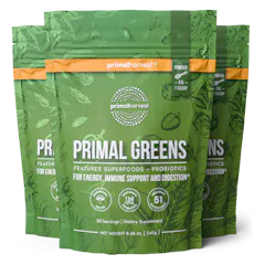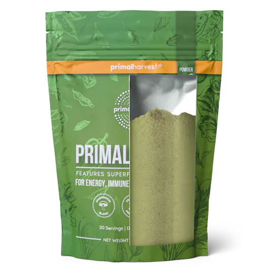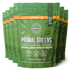 Primal Greens is a daily greens supplement superfood drink that contains a nutrient-dense blend of vitamins, minerals, and herbs. Primal Greens powder offers a unique blend of vegetables, fruits, superfoods, digestive enzymes and probiotics, designed to help increase energy, support daily performance, immune health and overall wellness.*