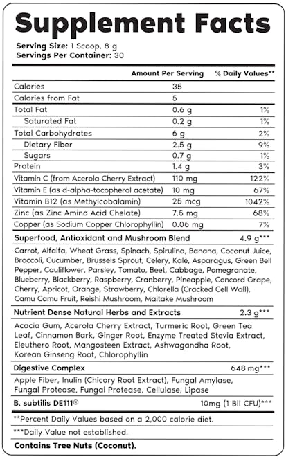 - Includes ingredients like chlorella, spirulina, wheatgrass, berries, spinach, kale, ginger, ashwagandha, and so much more!