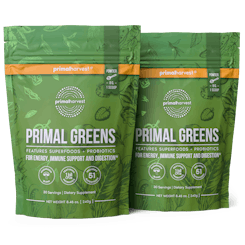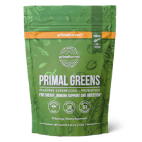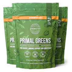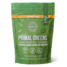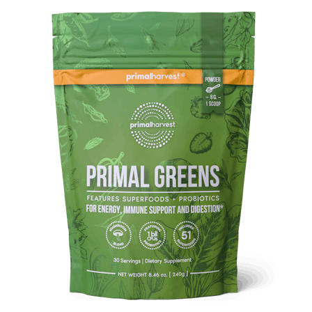 Primal Greens is a daily greens supplement superfood drink that contains a nutrient-dense blend of vitamins, minerals, and herbs. Primal Greens powder offers a unique blend of vegetables, fruits, superfoods, digestive enzymes and probiotics, designed to help increase energy, support daily performance, immune health and overall wellness.*