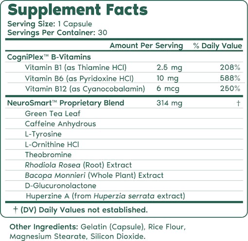 A cognitive support formula featuring a blend of B-vitamins, amino acids, and nootropic ingredients in just one capsule per day.*
