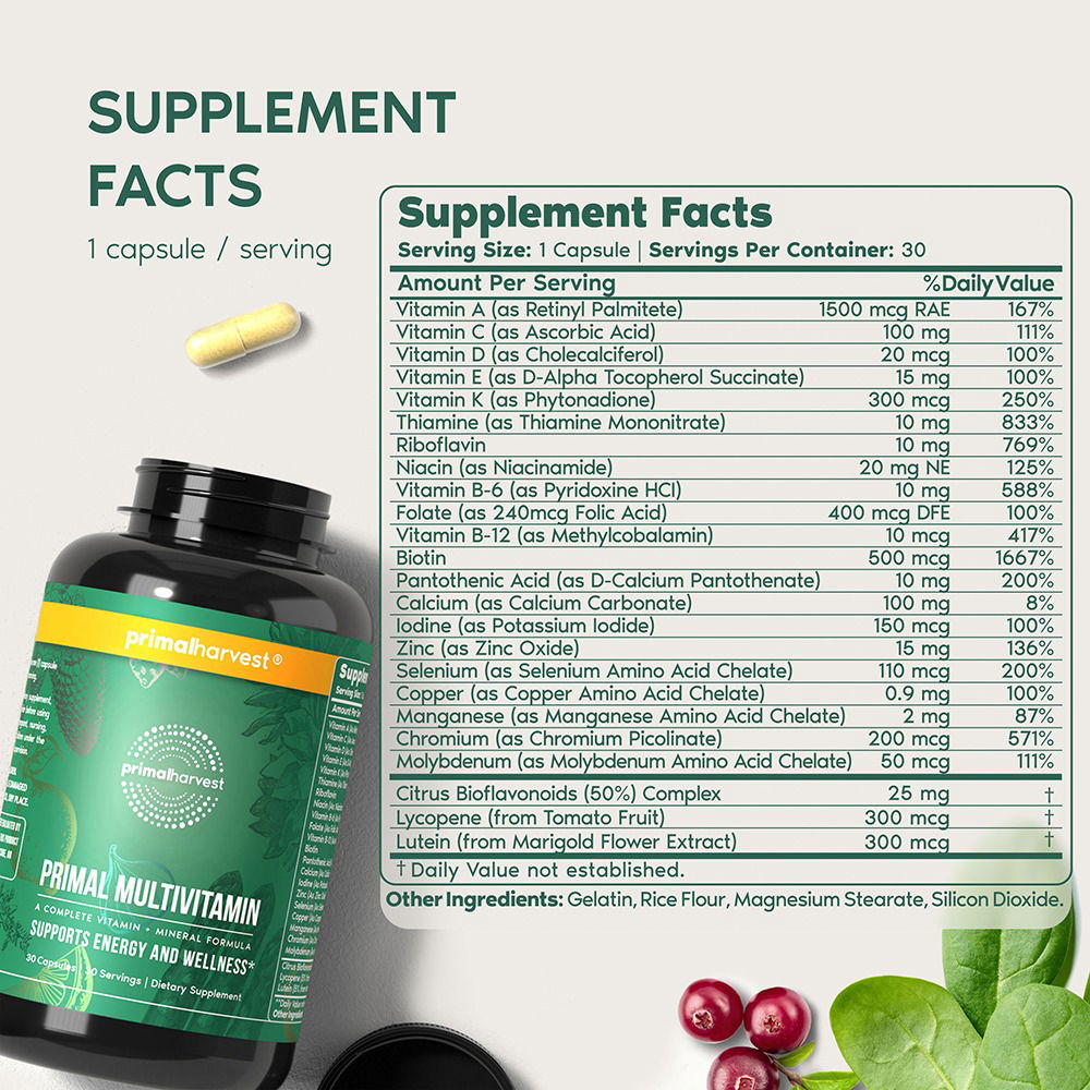 Primal Multivitamin is a daily multivitamin supplement that contains a blend of 21 key vitamins and minerals for foundational health support. Primal Multivitamin offers a unique blend of vitamins, minerals, and antioxidants in a convenient once-daily capsule.*